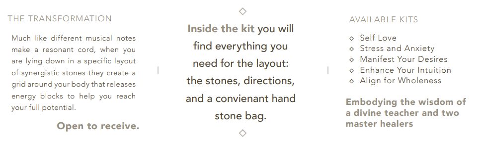 There are between four and seven different crystals in each kit that are carefully selected to work in tandem to create an energetic environment fostering dramatic shifts in any aspect of a person’s life.